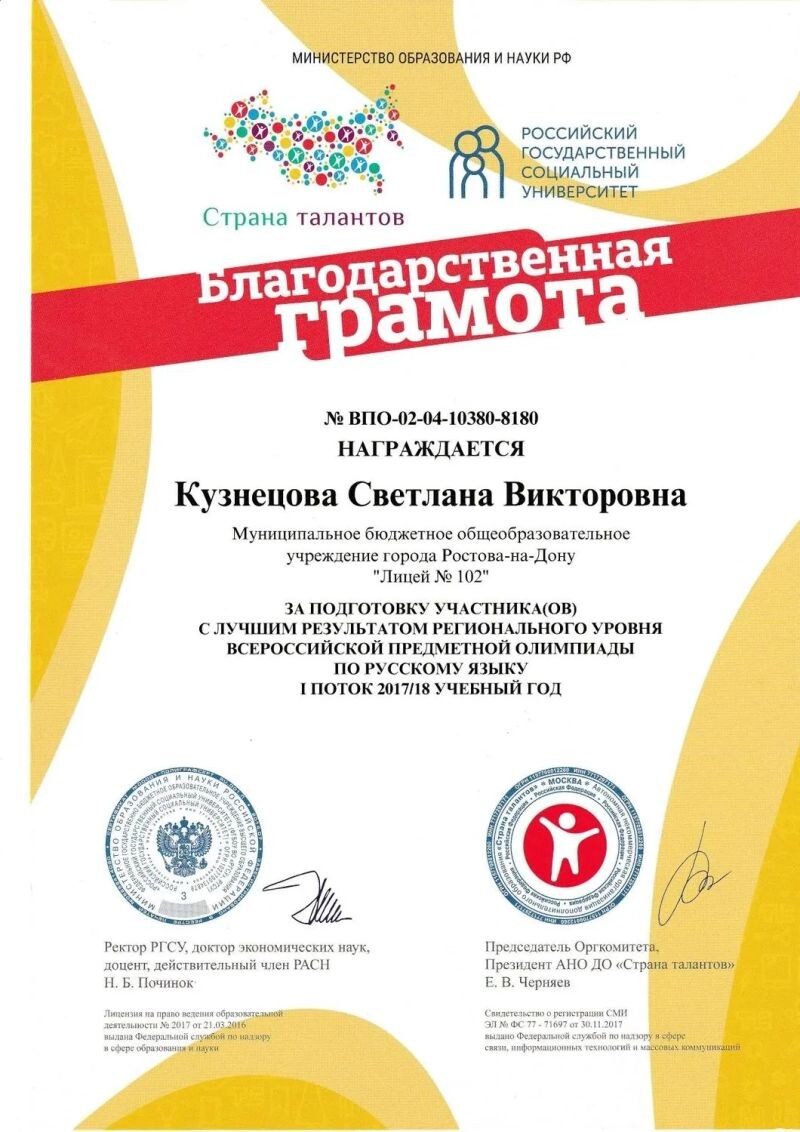 - Благодарственная грамота Российского социального университета за подготовку победителя олимпиады по русскому языку регионального уровня всероссийской олимпиады школьников, 2017 г.