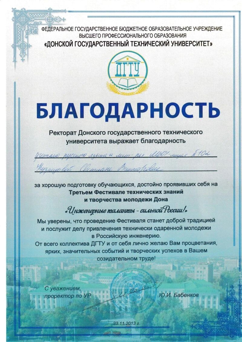 - Благодарность ректората Донского государственного технического университета за хорошую подготовку участников Третьего Фестиваля технических знаний творчества молодёжи Дона, 2013 г.