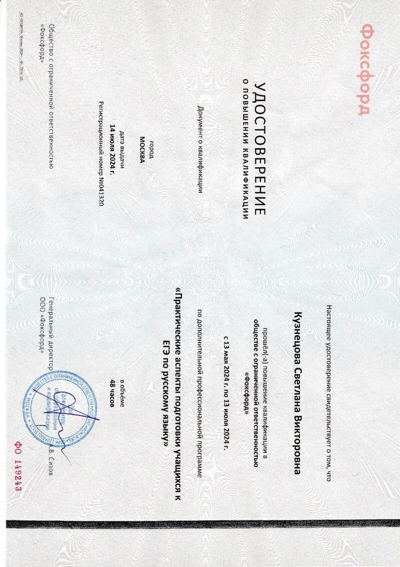 - Онлайн-школа, программа «Практические аспекты подготовки учащихся к ЕГЭ по русскому языку», 2024 г.
