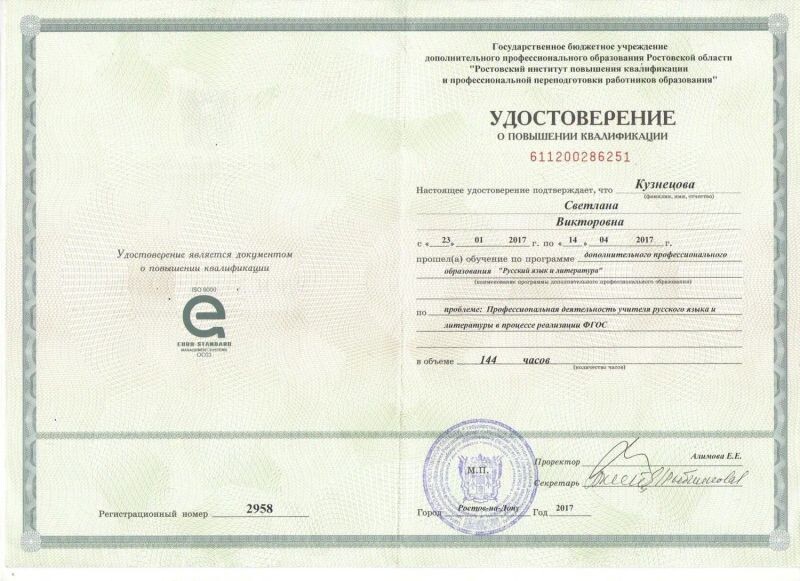 - Ростовский институт повышения квалификации и переподготовки работников образования, курсы повышения квалификации «Русский язык и литература» в объёме 144 ч, 2016–2017 гг.