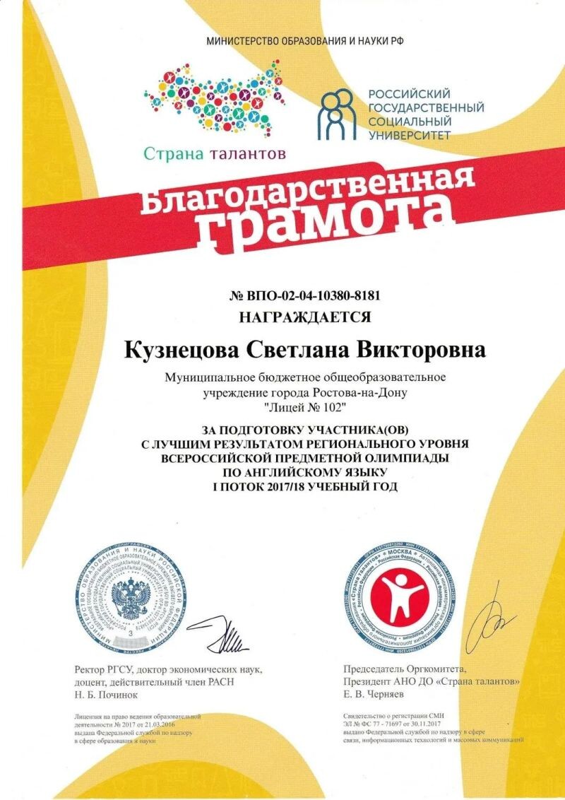 - Благодарственная грамота Российского социального университета за подготовку победителя регионального этапа всероссийской олимпиады по английскому языку, 2017 г.