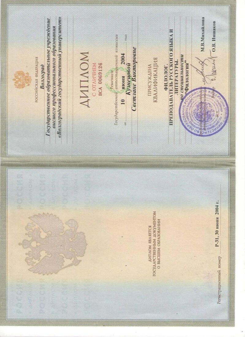 - Волгоградский государственный университет, филолог, преподаватель русского языка и литературы по специальности «филология». Диплом с отличием, 1999–2004 гг.