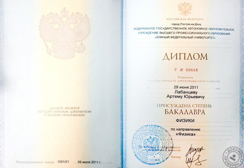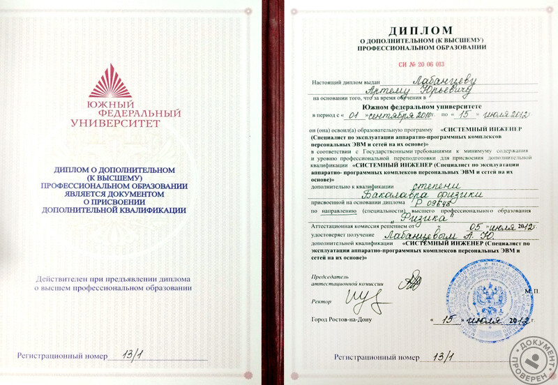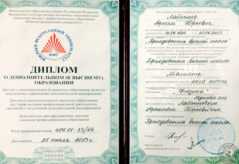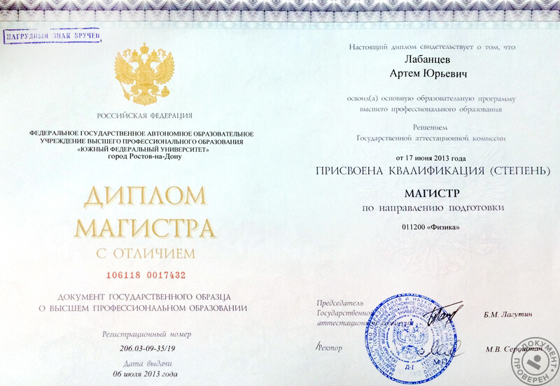 - Окончил с отличием магистратуру ЮФУ, физический факультет, направление – физика (2013 г.); в 2011 году получил степень бакалавра. Диплом о дополнительном (к высшему) образовании по специальности «Преподаватель высшей школы» (2013 г.).