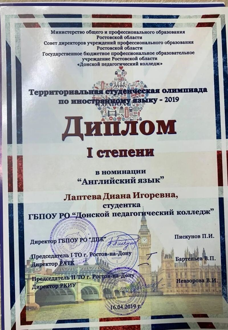 - Территориальная студенческая олимпиада по иностранному языку, диплом 1 степени, 2019 г.