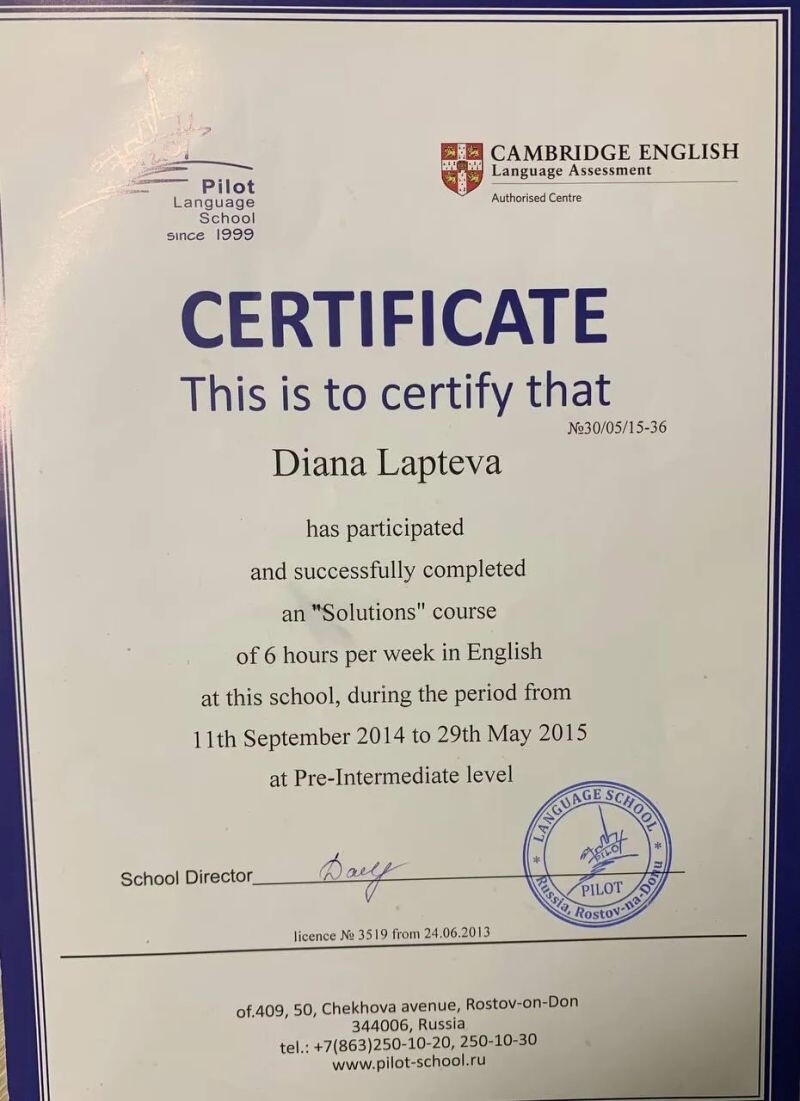 - Language school Pilot, курс «Английский язык», 2015 г.