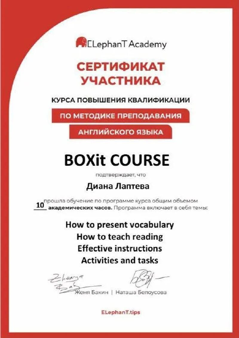- Elephant Academy, курс «Методика преподавания английского языка», 2022 г.