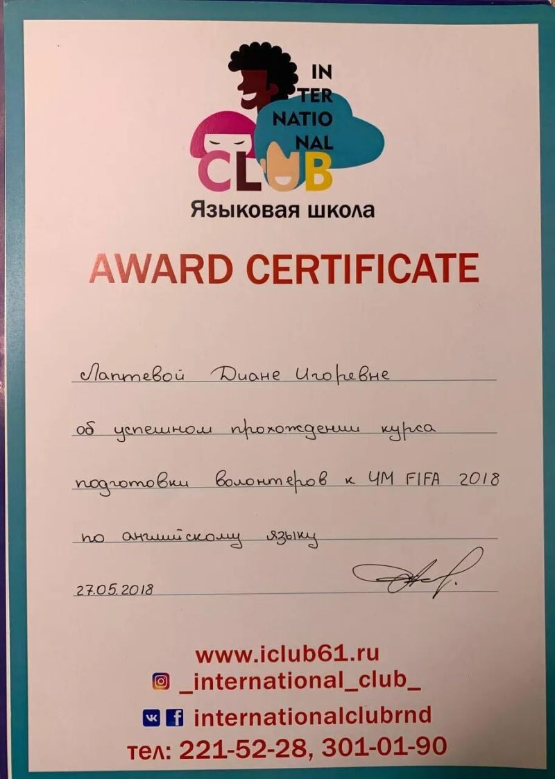 - International club, курс «Подготовка волонтёров к ЧМ FIFA 2018 по английскому языку».