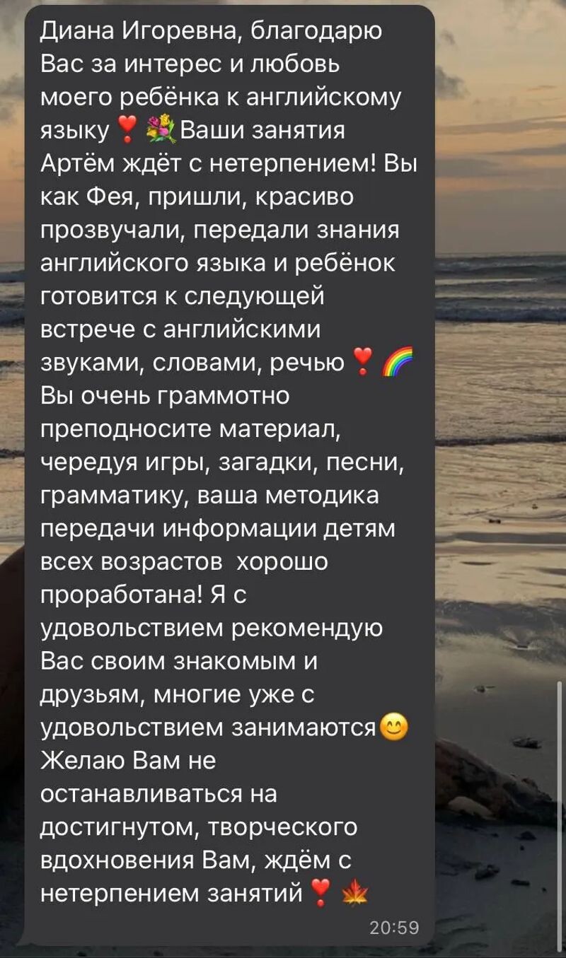 Диана - отличный профессиональный педагог. Комфортно работать вместе. Интересные, доступные и познавательные занятия. Индивидуальный подход к ученику и запросу.