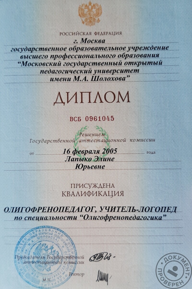- Московский государственный открытый педагогический университет им. М.А. Шолохова, квалификация – олигофренопедагог, 2005 г.