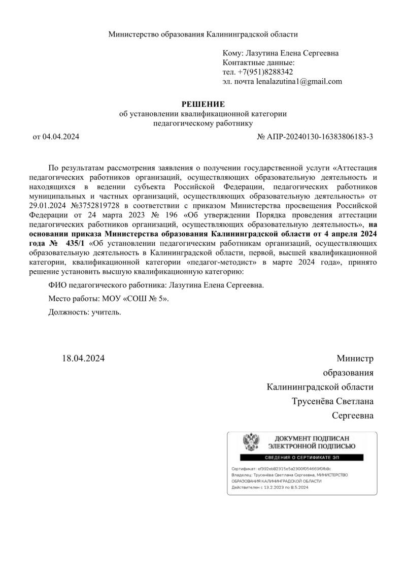 - Приказ об установлении высшей квалификационной категории (с 2024 г.).