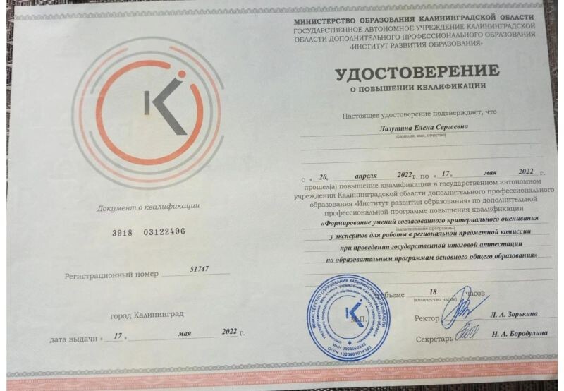 - Удостоверение о повышении квалификации "Эксперт ОГЭ" (с 2022 г.).