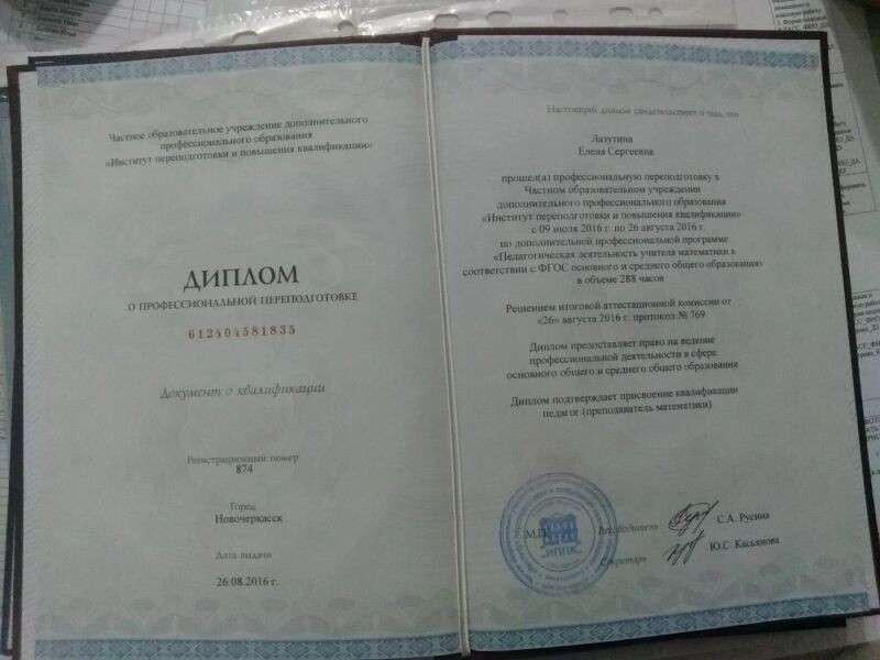 - Диплом о профессиональной переподготовке в Институте переподготовки и повышения квалификации, преподаватель математики, 2015–2016 гг.