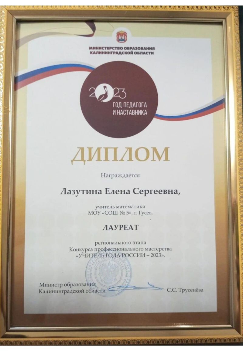 - Министерство образования Калининградской области, диплом лауреата регионального этапа конкурса «Учитель года России — 2023» Калининградская область.