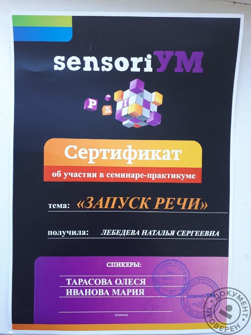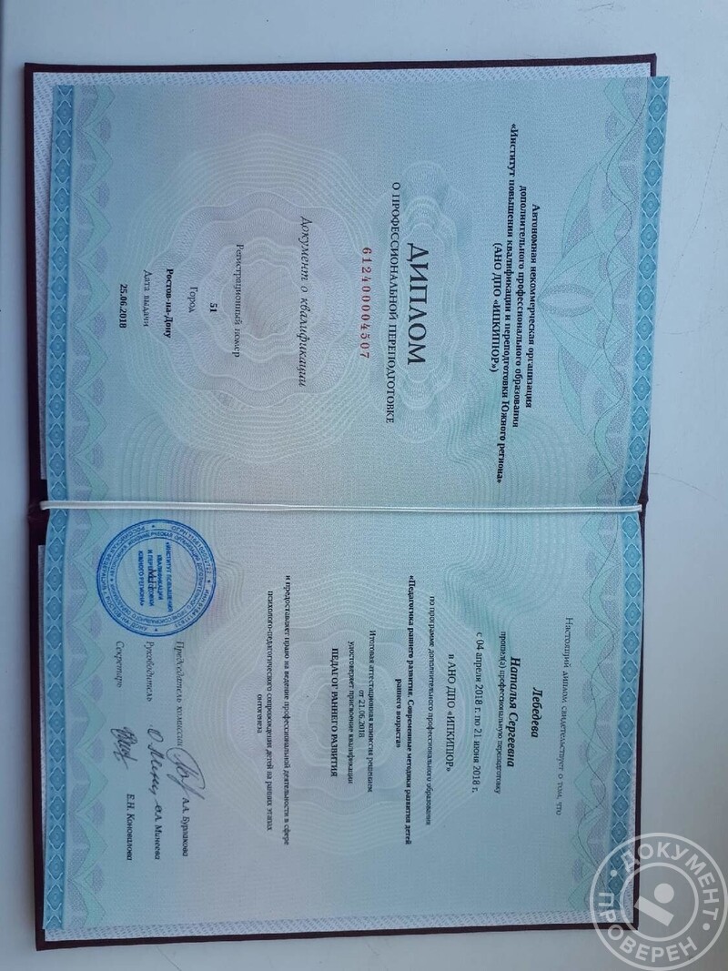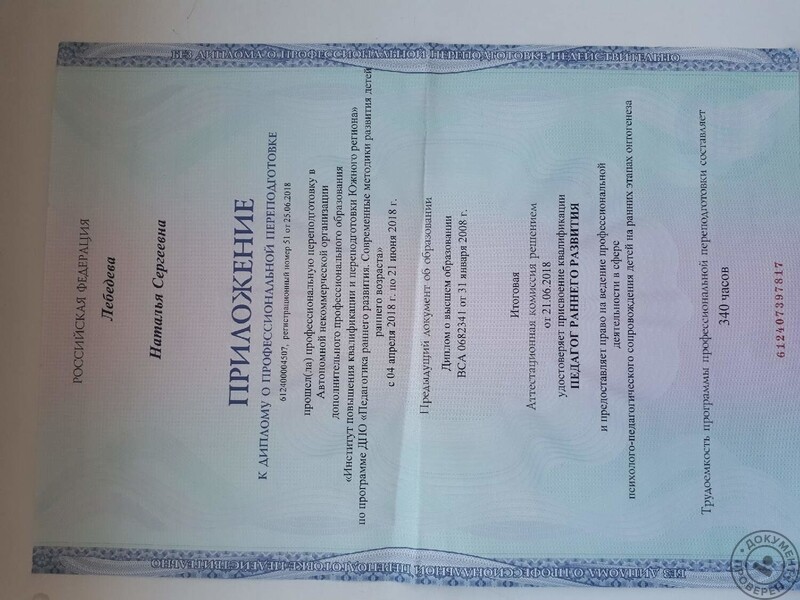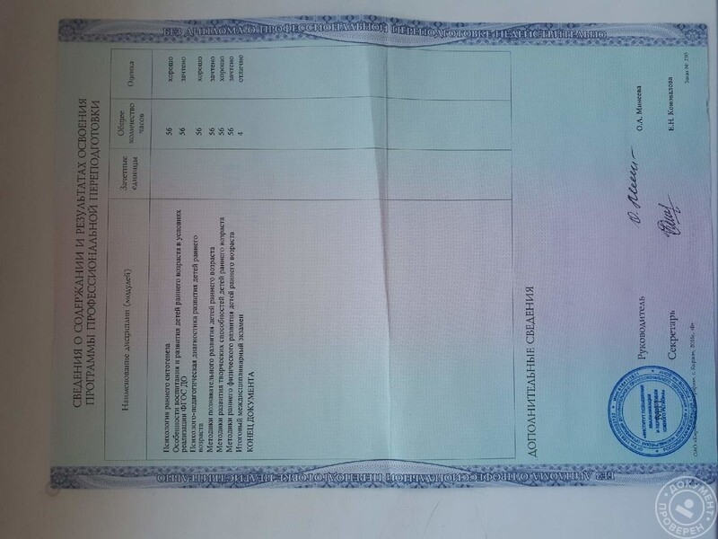 - Институт повышения квалификации, педагог раннего развития, 2018 г.