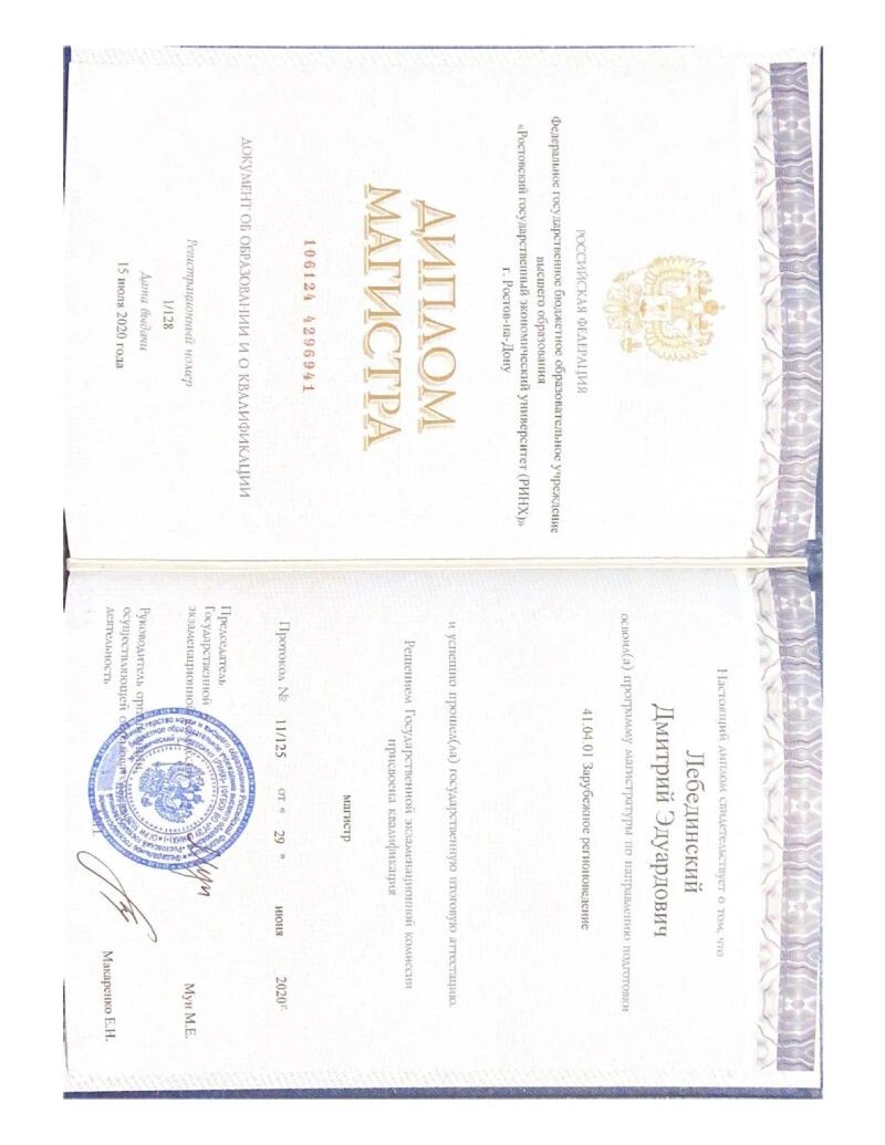 - ФГБОУ ВО «Ростовский государственный экономический университет», «зарубежное регионоведение», магистр, 2018–2020 гг.