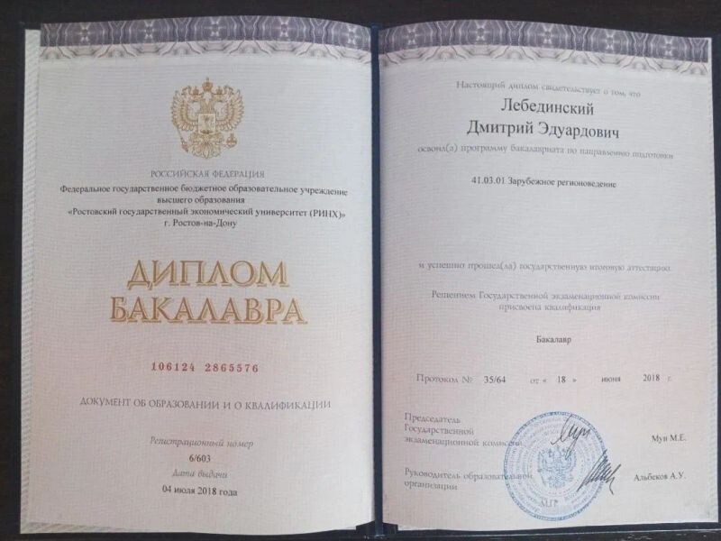 - ФГБОУ ВО «Ростовский государственный экономический университет», «зарубежное регионоведение», бакалавр, 2014–2018 гг.