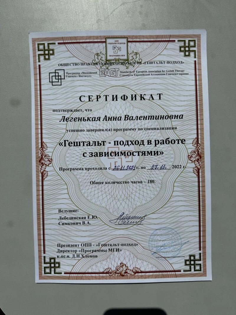 - Общество практикующих психологов «Гештальт-подход», программа «Московский гештальт институт», программа «Гештальт-подход в работе с зависимостями», 180 ч, 2021–2022 гг.