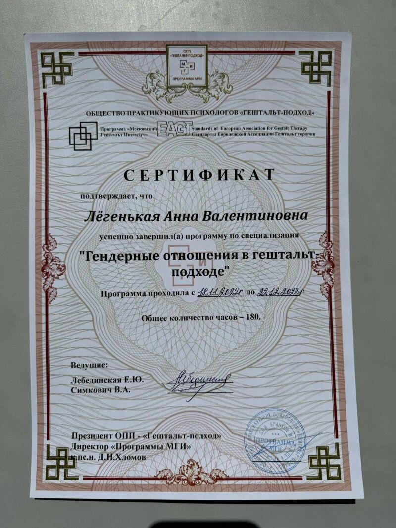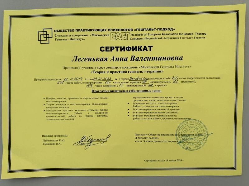 - Московский Гештальт Институт, Гештальт, 930 часов, 2019–2023 гг.