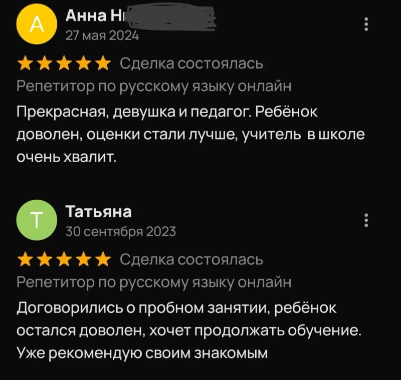Очень хороший специалист, понимаю материал, на уроках получаю 5, просто и интересно проходят занятия. 🌸За 5 месяцев обучения стала получать только 5, раньше могли быть и 3, последнюю контрольную написала на 5. ♥️Очень советую это специалиста, спасибо большое)🌷