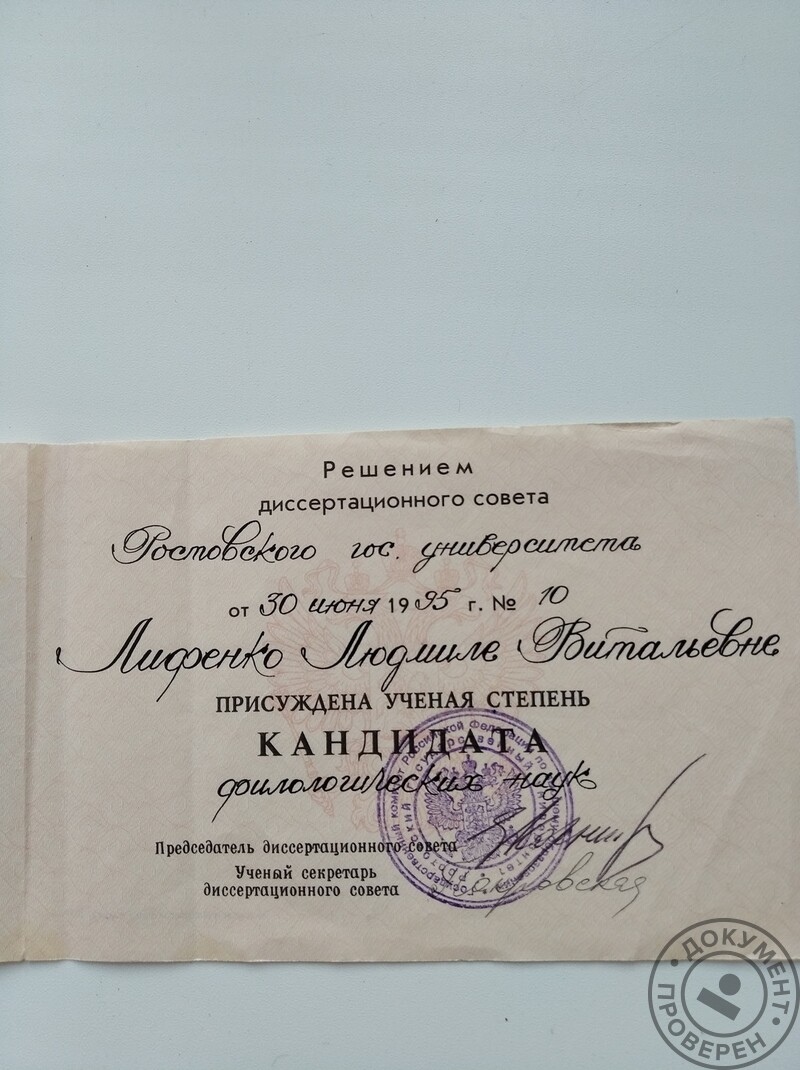 - Кандидат филологических наук (1991 г.), доцент (1995 г.).