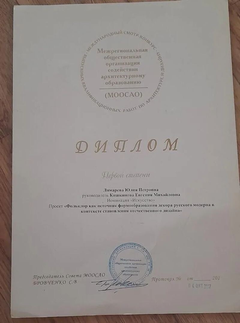 - Диплом 1 степени за доклад на научной конференции на тему: «Красота и искусство как инструмент преодоления декаданса в России конца XIX века», 2016 г.