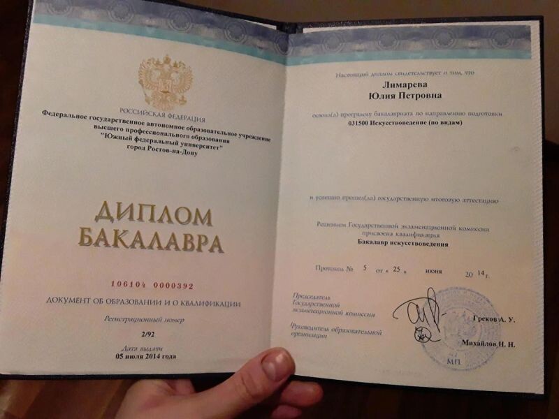 - ЮФУ, институт архитектуры и искусств, специальность – искусствоведение, бакалавр, 2009–2014 гг.