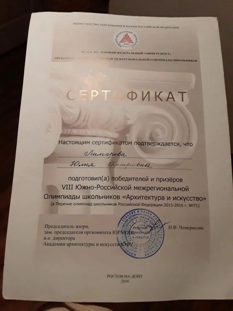 - Грамота за подготовку призеров олимпиады школьников, 2016 г.