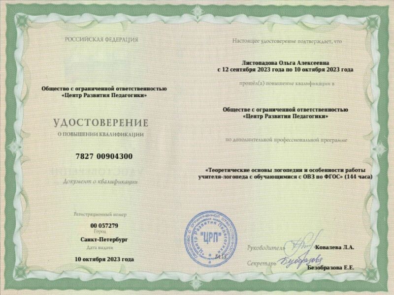 - ООО "Центр Развития Педагогии". Теоретические основы логопедии и особенности работы учителя- логопеда с ОВЗ по ФГОС, 2023 г.