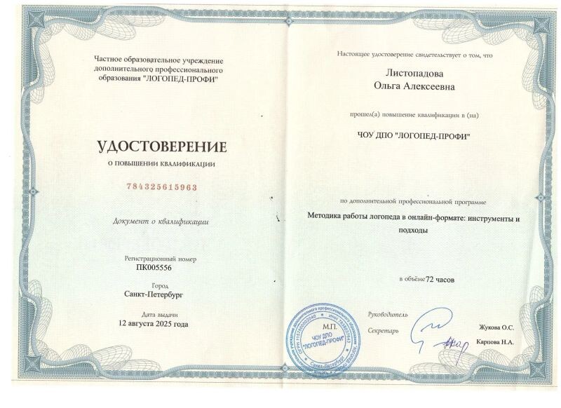 - Частное образовательное учреждение дополнительного профессионального образования "ЛОГОПЕД-ПРОФИ". Методика работы логопеда в онлайн-формате: инструменты и подходы, 2025 г.