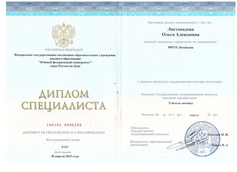 - Федеральное государственное автономное образовательное учреждение высшего образования "Южный федеральный университет" город Ростов- на- Дону. Учитель- логопед, 2009–2015 гг.