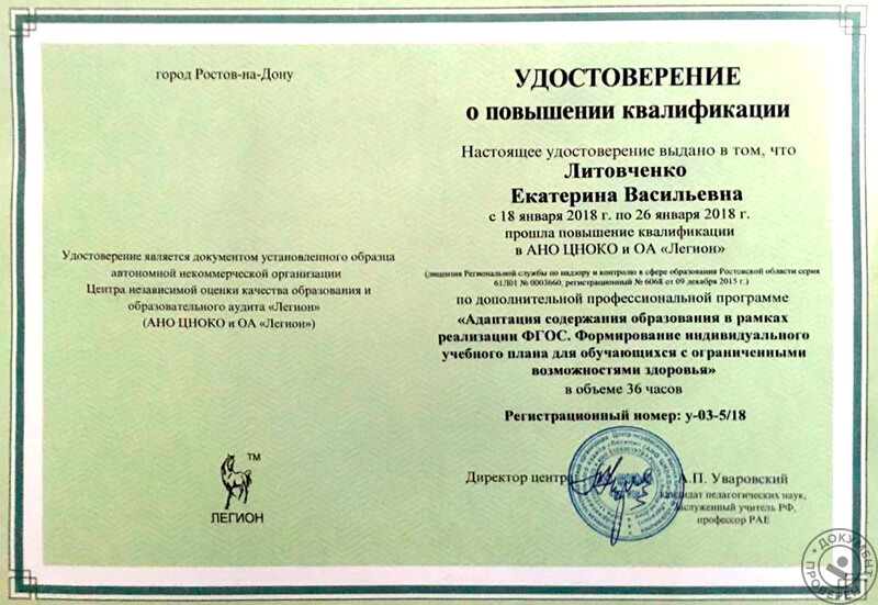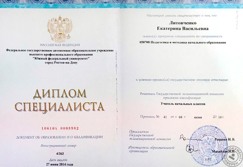 - Окончила Южный федеральный университет, Академия психологии и педагогики, специальность – педагогика и методика начального образования, специализация – коррекционно-педагогическая деятельность учителя, квалификация – учитель начальных классов, специалист (2014 г.).