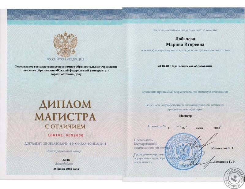 - Магистратура Южного Федерального университета, Институт филологии, журналистики и межкультурной коммуникации, профиль подготовки «Стилистика речи. Филологический анализ текста. Лингвистическая экспертиза», 2018 г.