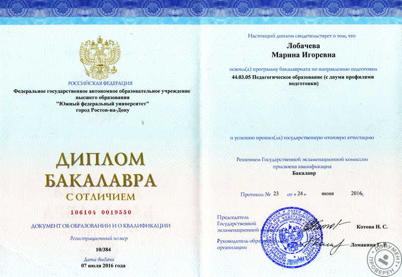 - Бакалавриат Южного федерального университета, Институт филологии, журналистики и межкультурной коммуникации, профиль – преподавание русского, английского языков, русского как иностранного, 2016 г.