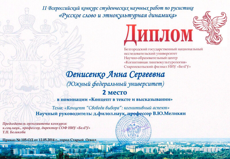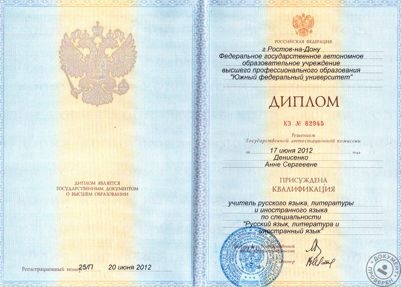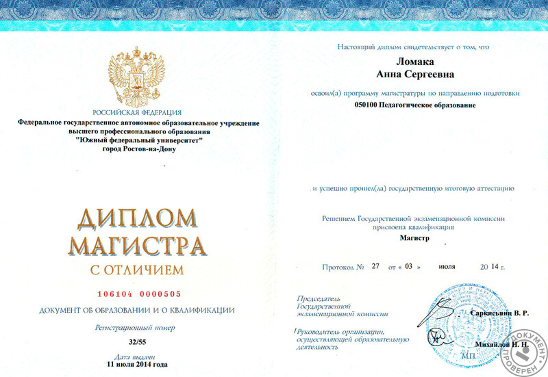 - ПИ ЮФУ, факультет лингвистики и словесности, направление – педагогическое образование, профиль – стилистика речи, филологический анализ текста, лингвистическая экспертиза, магистр, 2014 г.