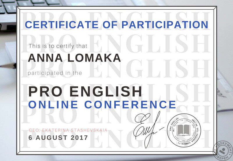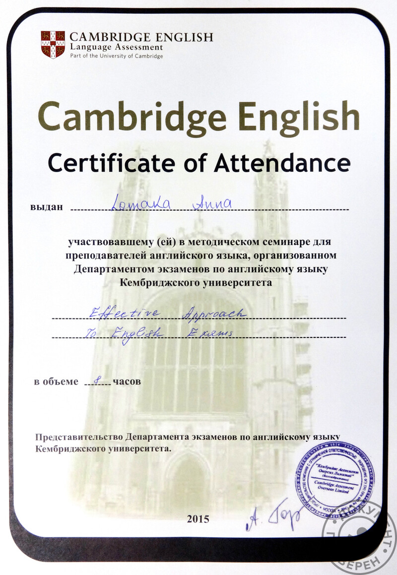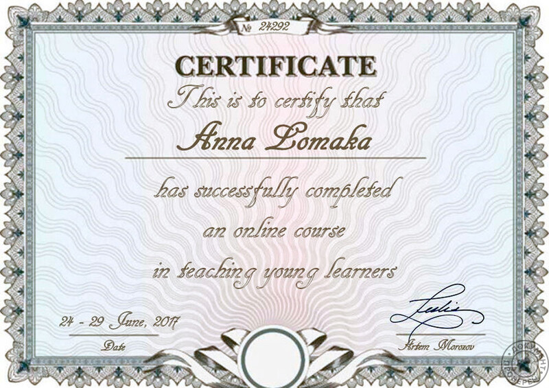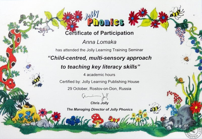 - Повышение квалификации: методические семинары Effective approach to English exams и Child-centered, multi-sensory approach to teaching key literacy skills (2015 г.); Teaching Young Learners, 2017 г.