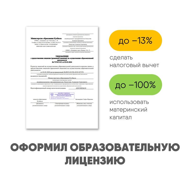 Преподаватель использует конспекты и презентации, которые ученик может изучать в удобное для него время, что делает процесс подготовки гибким и комфортным. Алексей Сергеевич обеспечивает качественную проверку знаний через домашние задания и регулярные зачеты, что способствует мотивации и качественному усвоению материала. Ученики и их родители отмечают повышение уровня знаний и успешную сдачу экзаменов, что является главным показателем результативности усилий педагога. Атмосфера на занятиях приятная и мотивирующая, что также производится на положительный результат. Спасибо Алексею Сергеевичу за его вклад в образовательный процесс и поддержку учеников в их стремлениях к успеху.