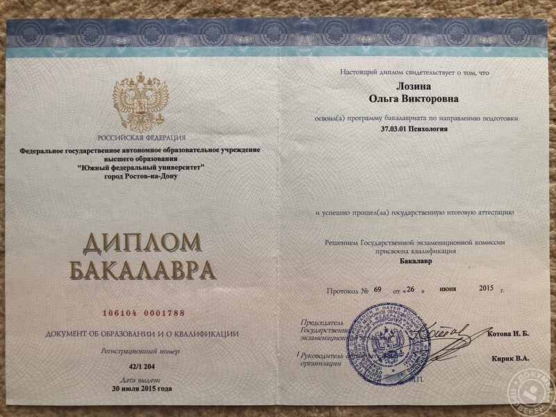 - Южный федеральный университет, бакалавр психологии, 2011–2015 гг.