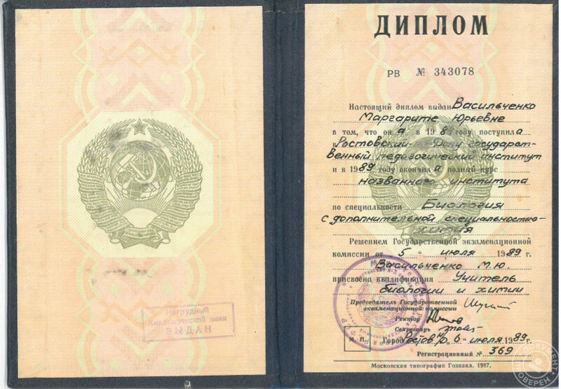 - РГПИ, факультет естествознания, специальность – учитель биологии с правом преподавания химии (1989 г.).
