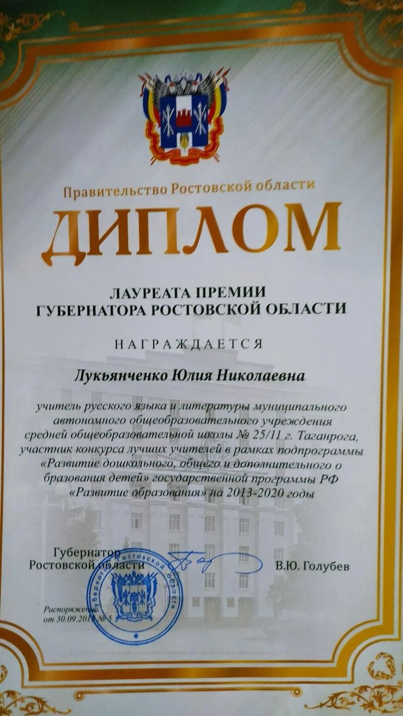 - Лауреат премии губернатора Ростовской области, 2015 г.
