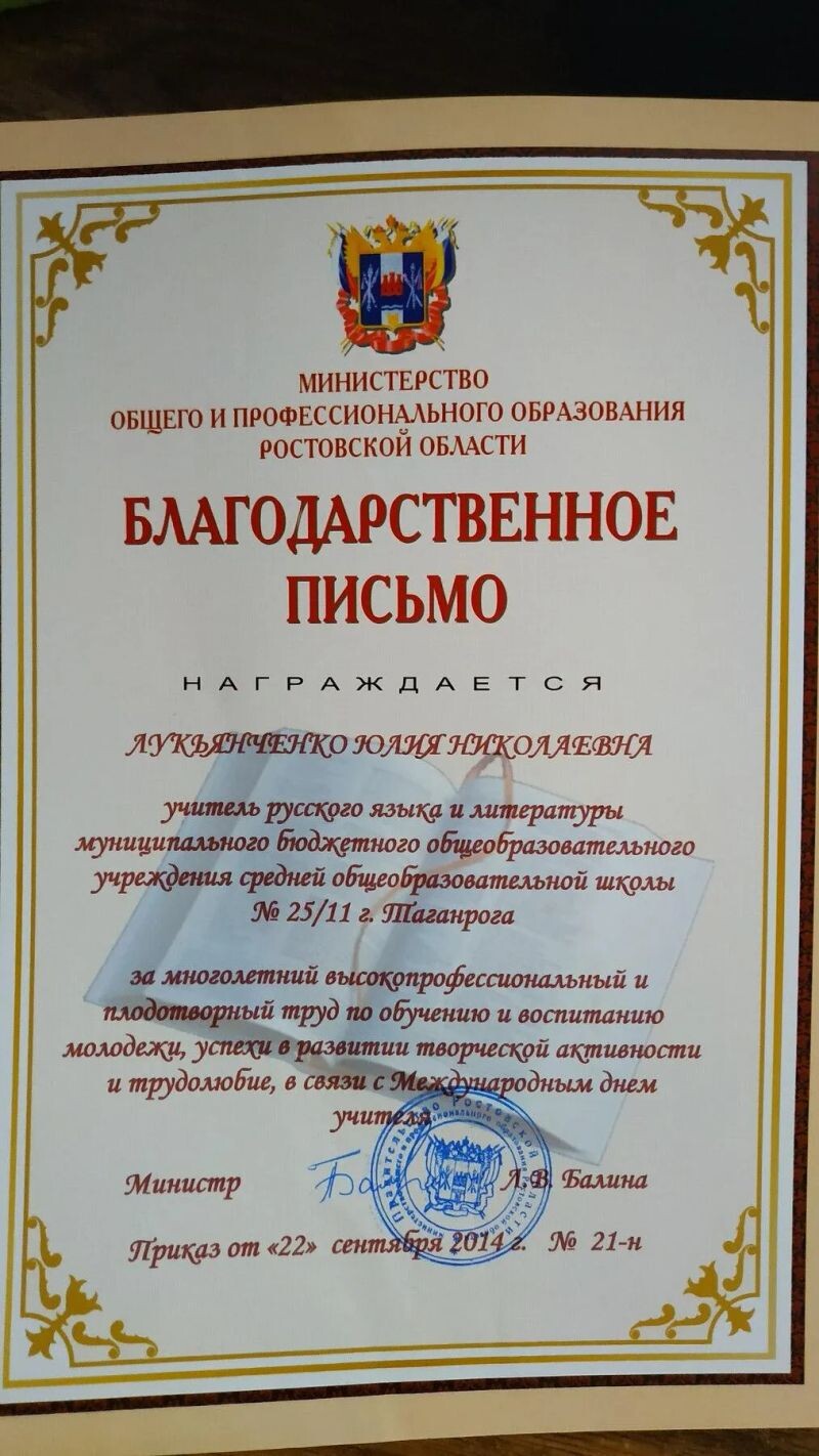 - Благодарственное письмо Министерства общего и профессионального образования Ростовской области, 2014 г.