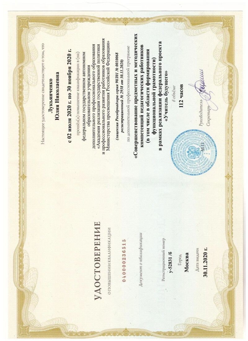 - АНО ДПО «Академия реализации государственной политики и профессионального развития работников образования», повышение квалификации различного уровня, 2020 г.