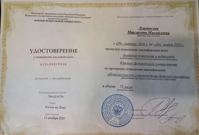 - ЮФУ, программа повышение квалификации «Психологическое сопровождение детского развития», 2020 г.