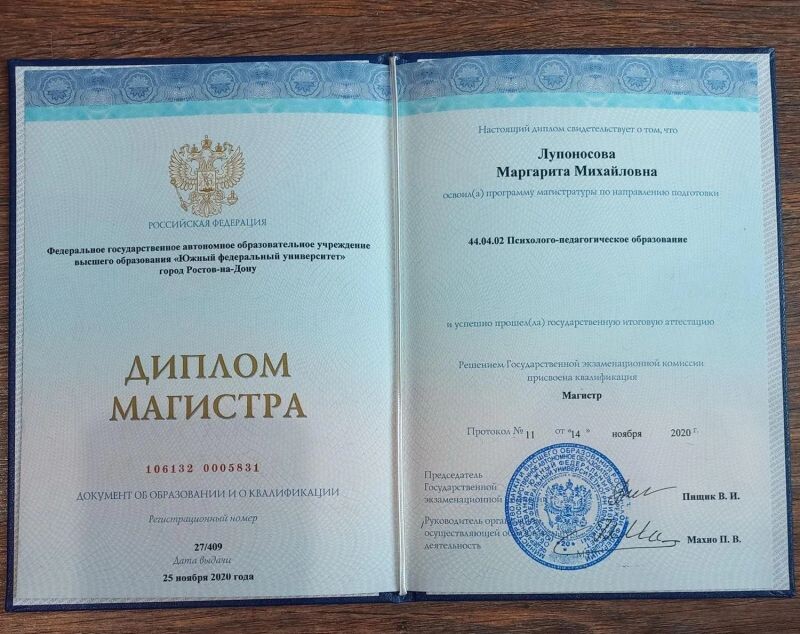 - Южный федеральный университет, Академия психологии и педагогики, психолого-педагогическое образование, 2018–2020 гг.