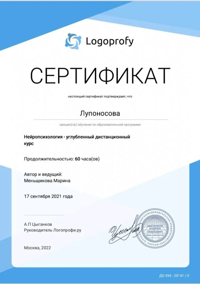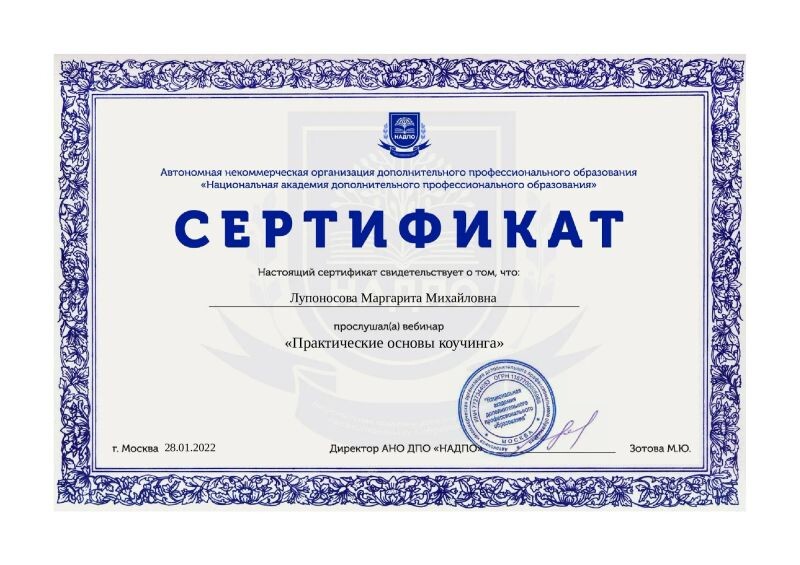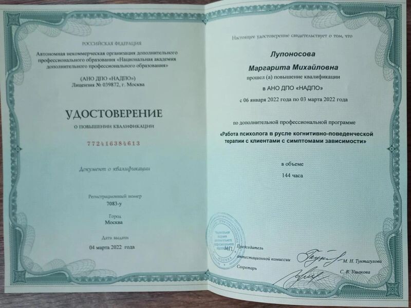- АНО ДПО «НАДПО», когнитивно-поведенческая терапия с клиентами с симптомами зависимости, 144 ч, 2022 г.