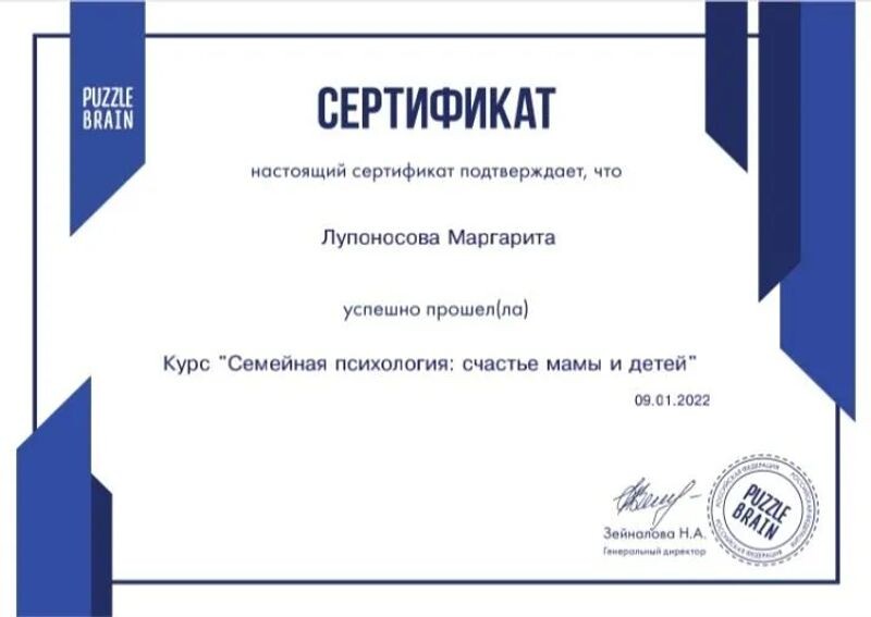 - Puzzle Brain, курс «Семейная психология: счастье мамы и детей», 2022 г.