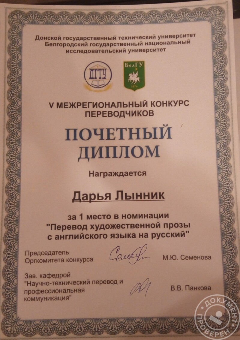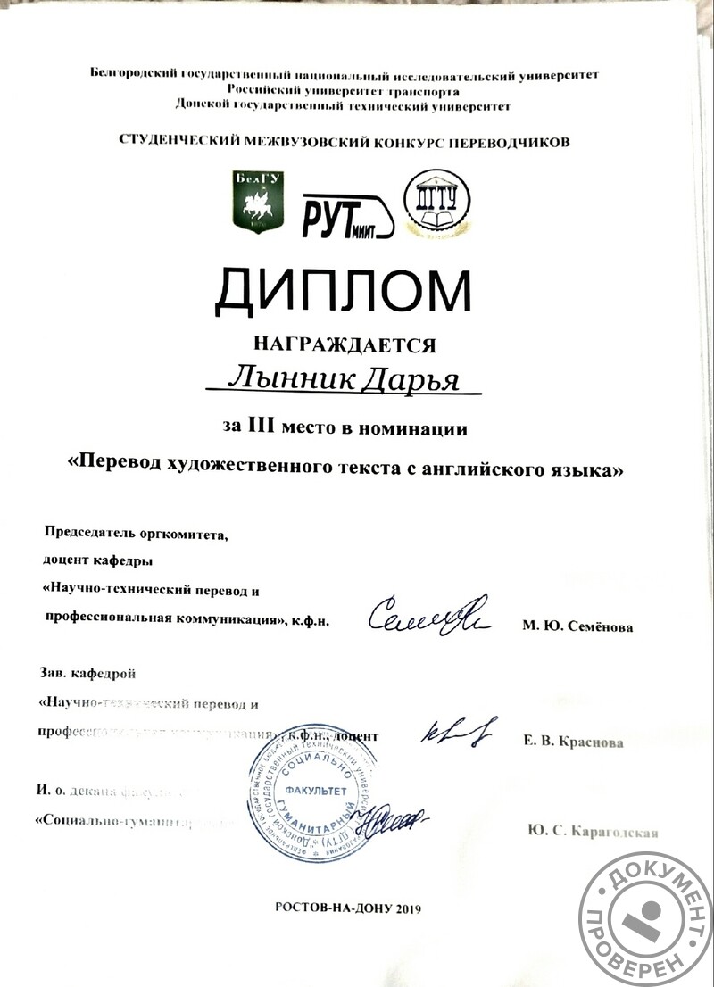 - Донской государственный технический университет, специализация – лингвистическое обеспечение межгосударственных отношений, специальность – перевод и переводоведение (английский и испанский языки), квалификация – лингвист, переводчик, 2014–2019 гг.