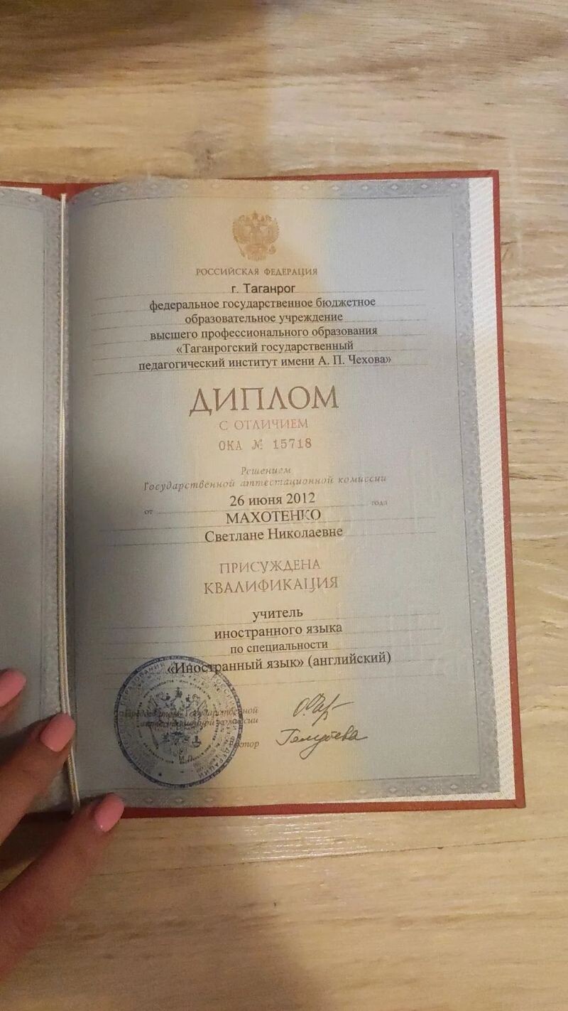 - Таганрогский государственный педагогический институт им. А.П. Чехова, иностранный язык (английский), 2012 г.