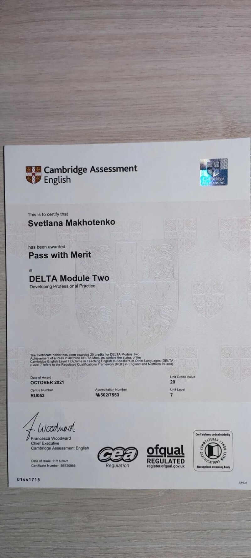 - Диплом о высшем образовании (преподаватель английского языка) (с 2012 г.).