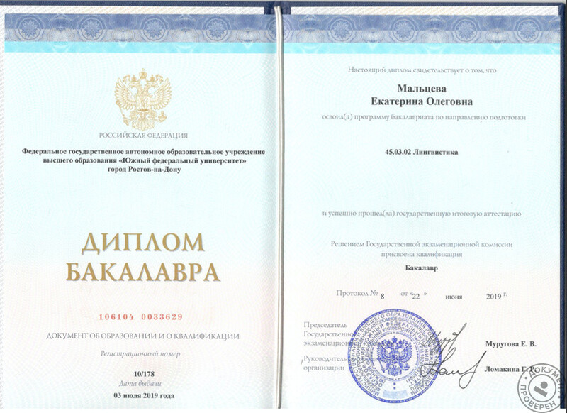- ФГАОУ ВО «ЮФУ», лингвистика, 2015–2019 гг.