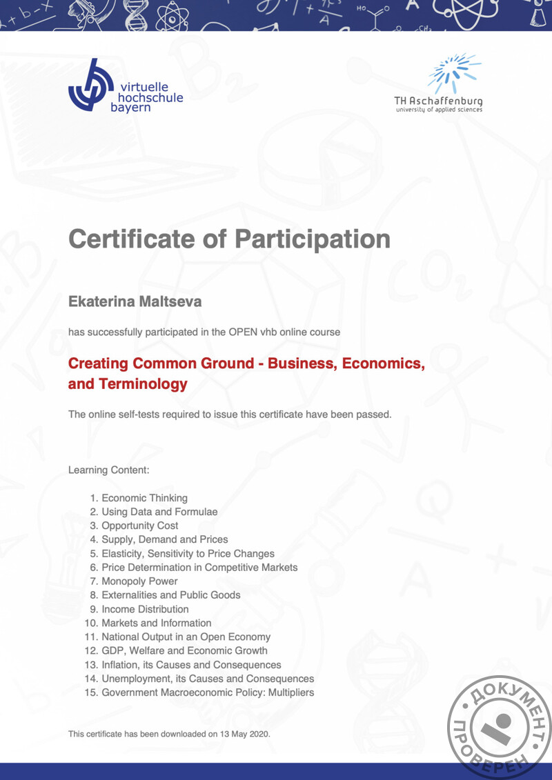 - Прохождение курса повышения квалификации «Creating common ground - business, economics, terminology» в TH Aschaffenburg, University of applied sciences, 2020 г.
